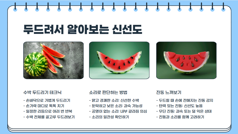 반면 소리가 ‘퍽퍽’하거나 ‘무거운 탁음’처럼 느껴지면 속이 물렀거나 익지 않은 수박일 수 있어요. 너무 딱딱한 소리는 수분이 부족하다는 의미예요.