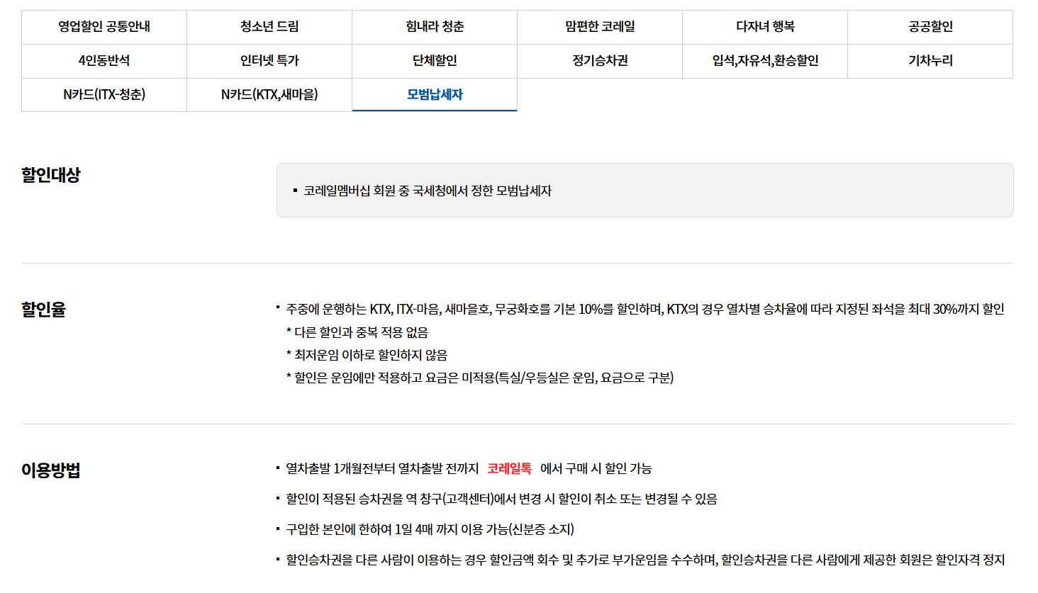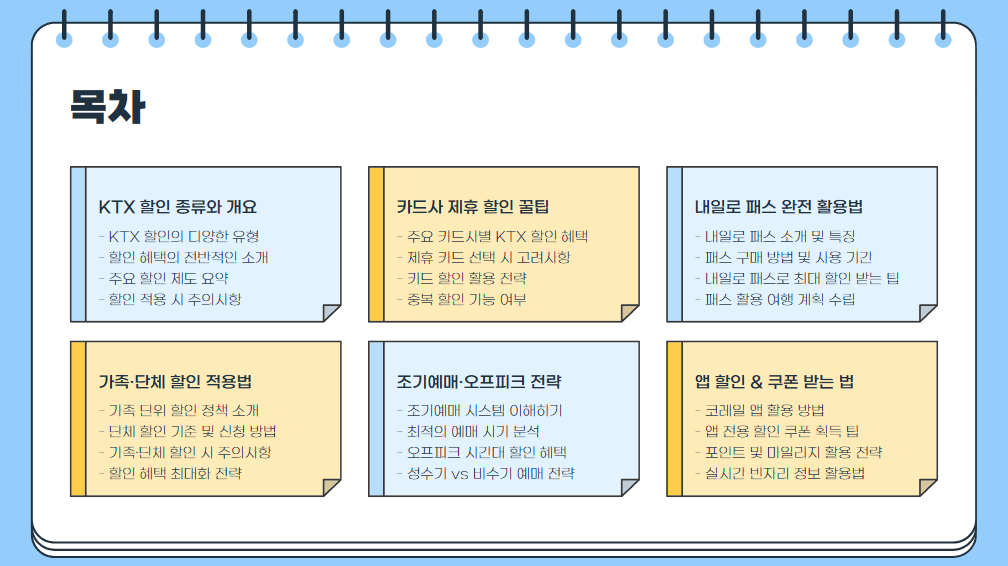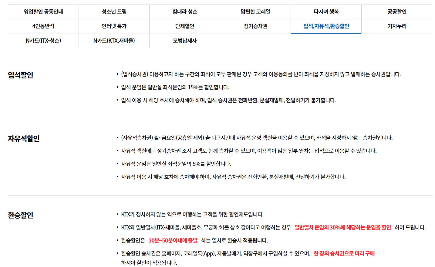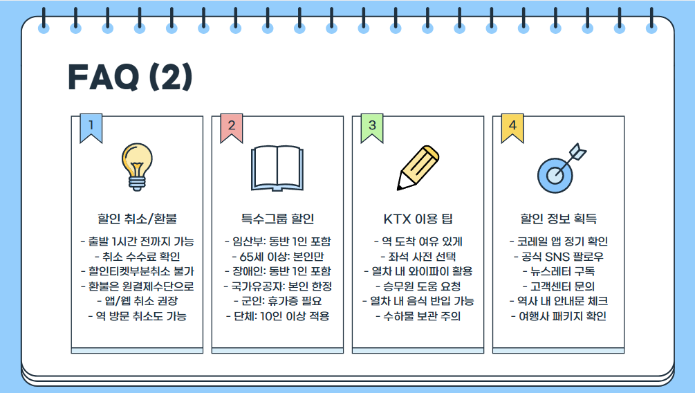 정리하자면, 자신의 조건(나이, 시간대, 목적 등)에 맞는 할인 항목을 골라 활용하면, 합리적으로 KTX를 탈 수 있어요!
