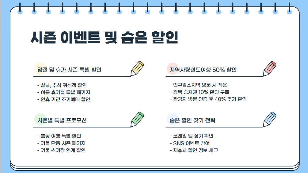 마지막으로 놓치기 쉬운 ‘시즌 한정 할인’과 ‘숨은 할인’이 있어요! 코레일은 매달 다양한 테마 이벤트를 열고 있어요. 이를 잘 노리면 깜짝 반값 티켓도 잡을 수 있어요.