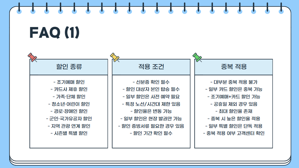 특히 2025년 기준으로 ‘역방향석 할인’, ‘출퇴근형 특별 할인’, ‘모바일 앱 전용 쿠폰 할인’ 등 새로운 제도도 추가되었답니다. 요일과 시간, 좌석 종류, 노선별로 조건이 다르기 때문에 사전에 꼭 확인해보는 습관이 필요해요.