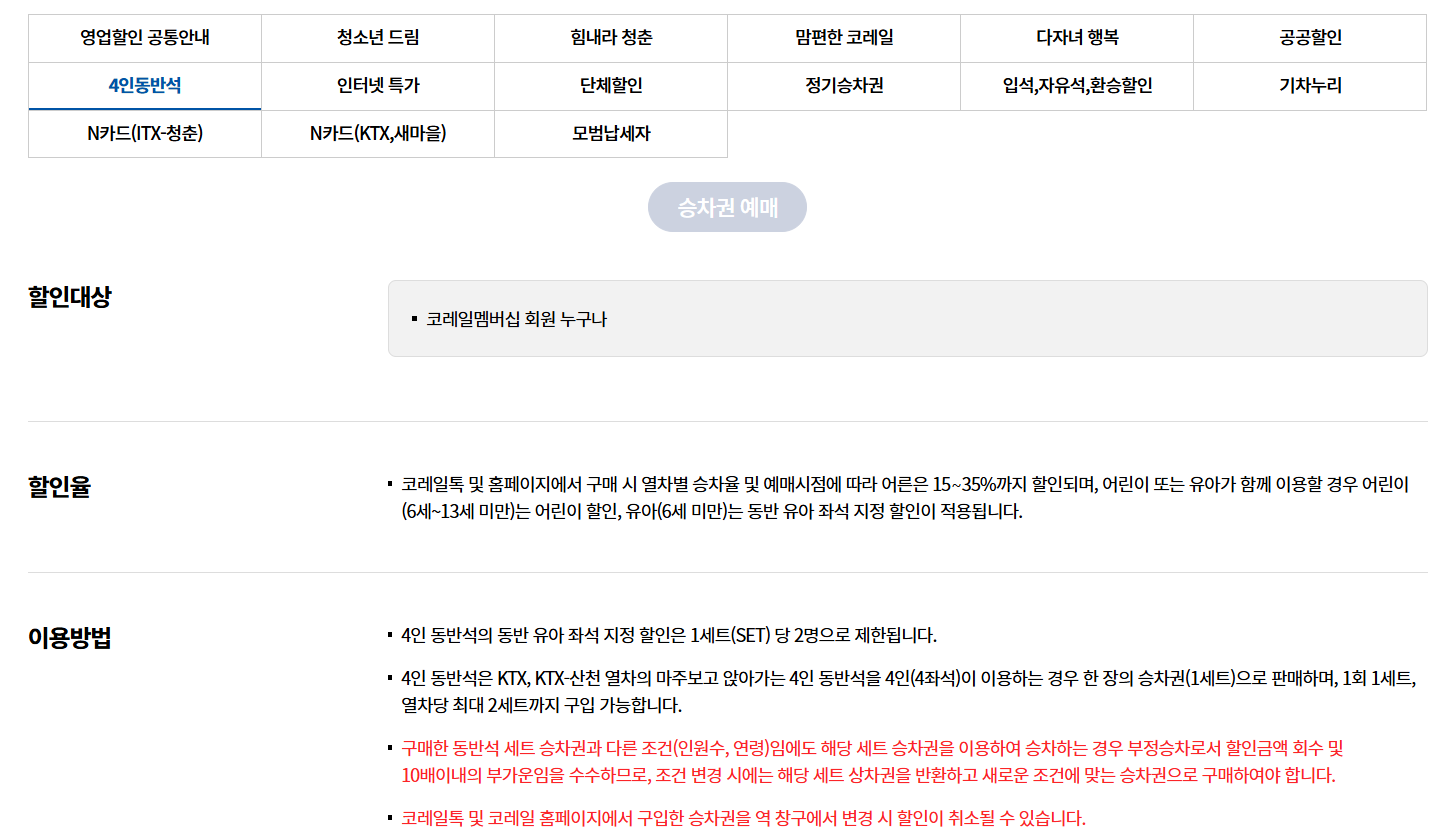 혼자 여행하는 것도 좋지만, 가족이나 친구들과 함께 떠나는 여행이라면 ‘단체 할인’이나 ‘가족 할인’이 큰 도움이 돼요. 코레일은 4명 이상이 동시에 표를 예매할 경우, 단체 요금제를 자동 적용해줘요. 요금의 10~30%까지 절감할 수 있답니다.