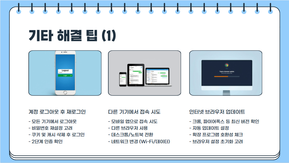 A7. 로그인 상태 확인하고, 다른 기기에서도 접속해보세요.